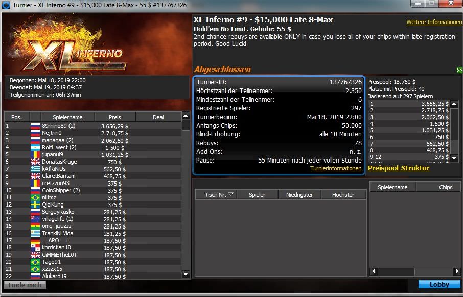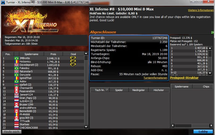 Deutschsprachige Spieler tauchen bei den Xl-Inferno-Turnieren leider nicht auf den Spitzenplätzen auf, dafür konnte „Kuki1983“ beim $215 PKO mit dem dritten Platz glänzen und über $2.500 Preisgeld abräumen.