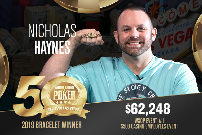 In der Nacht von Freitag auf Samstag ging es beim WSOP 2019 Event#1 in die Entscheidung und der Kanadier Nicholas Haynes gewinnt das $500 Casino Mitarbeiter Bracelet. Haynes setzt sich im 686 Spieler starken Feld durch und nimmt stolze $62.345 Preisgeld mit nach Hause.