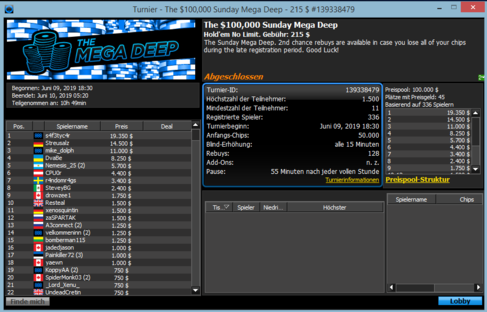 Beim größten Sonntagsturnier, dem $215 Sunday Mega Deep kamen 336 Spieler (+128 Re-Entries) zusammen und spielten um die Garantiesumme von $100.000. Hier musste sich der deutsche Online-Grinder „Streusalz“ erst im Heads Up „s4f3tyc4r“ geschlagen geben und nahm Platz 2 für $14.500. Der Österreicher „CPU0r“ belegte noch Platz 6 für $4.400.