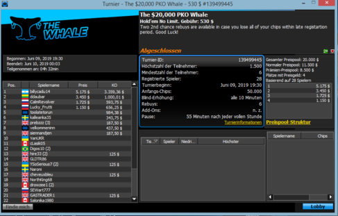 Das teuerste Turnier am Sonntag war das $530 PKO Whale, bei dem 28 Highroller (+ 6 Re-Entries) um die Garantie von $20.000 spielten. Der Sieg und $5.175 + $3.359 Bounties ging nach Argentinien an „billycadu14“.