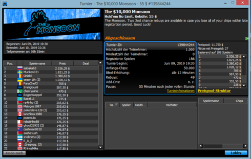 Beim $55 Monsoon kamen 186 Spieler (+ 49 Re-Entries) an den virtuellen Tischen zusammen und es ging um ein Preisgeld von $11.750. Am Ende konnte sich der Russe „sabaka63“ durchsetzen und das Event für ein Preisgeld von $2.526 gewinnen.