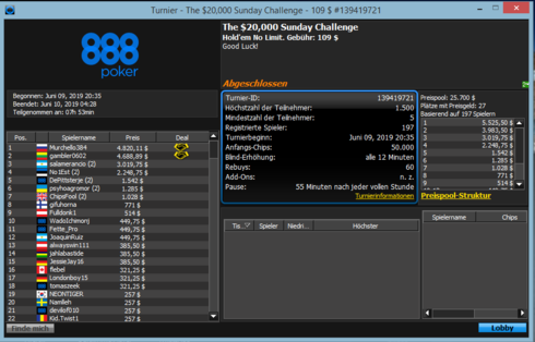 Zum Abschluss des Tages wurde noch die $109 Sunday Challenge gespielt. Hier kämpften 197 Teilnehmer (+ 60 Re-Entries) um einen Preispool in Höhe von $25.700. Der Sieg und $4.820 gingen nach einem Heads-Up Deal an den Russen „Murchello384“. Platz 9 holte sich der Österreicher „Fulldonk1“ für $514.