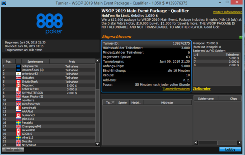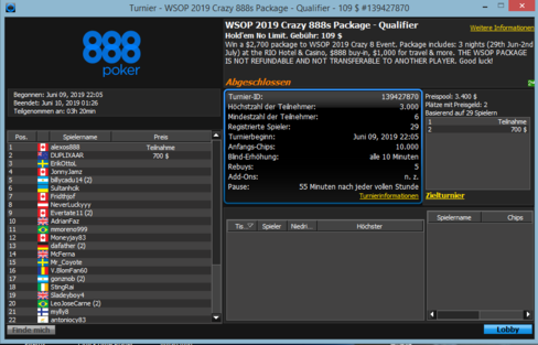 Außerdem gab es noch den $109 WSOP Crazy 888 Qualifier. Hier ging das $2.700 Package nach Kanada an „alexas888“.