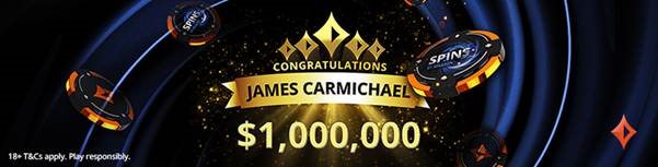 Am Dienstag konnte James „James23C“ Carmichael als erster Spieler auf partypoker bei einem $5 SPINS die eine Million Dollar abräumen.