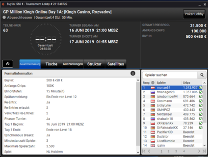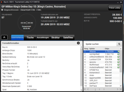 | Thu 27.06. 16:00 | King's Deepstack Cup - Final Day | 50.000 EUR | - | - |