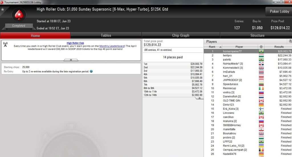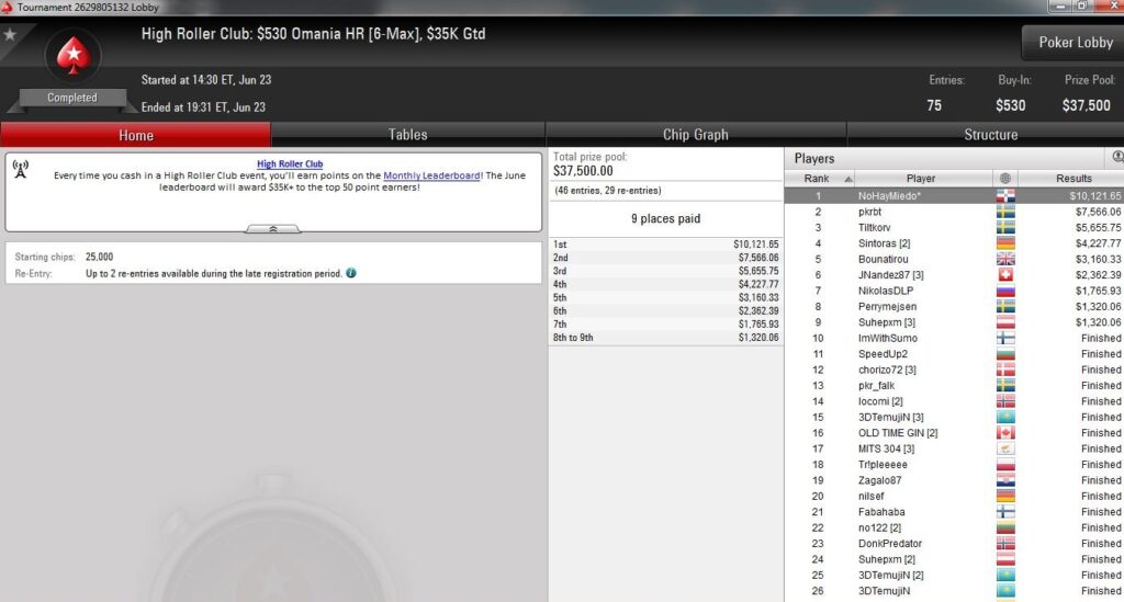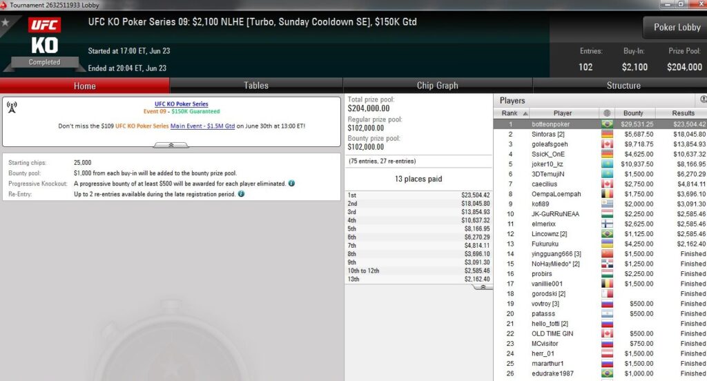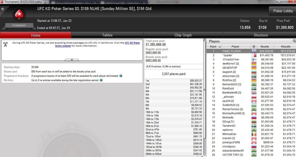 Dabei ging Event #2, das $530-Highroller-Turnier, mit einer Siegprämie von über $67.000 an den Ungarn Andras „probirs“ Nemeth, während die Sunday Million, die als Event #3 der UFC KO Series und damit als Bounty-Turnier ausgetragen wurde, vom Griechen „PANIC PLAYER“ gewonnen wurde.