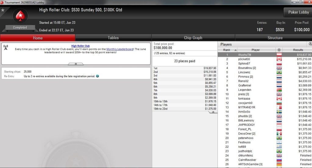 Eines davon war das Sunday 500, bei dem 187 Spieler um die garantierten $100.000 konkurrierten. Thomas „WushuTM“ Mühlöcker freute es doppelt – er gewann das Turnier ohne Deal und kassierte die volle Summe von knapp $20.000 für den Sieger.