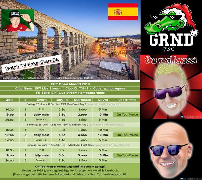 Am Sonntagnachmittag gibt es ab 12:30 Uhr den Livestream vom Finale des €1.000+€100 PokerStars Live European Poker Tour Open Madrid Main Event live aus dem Casino Gran Madrid. Der Stream wird 30 Minuten zeitversetzt auf Deutsch von Felix „xflixx“ Schneiders, Jens „Knossi“ Knossalla und Martin „Potti“ Pott kommentiert.