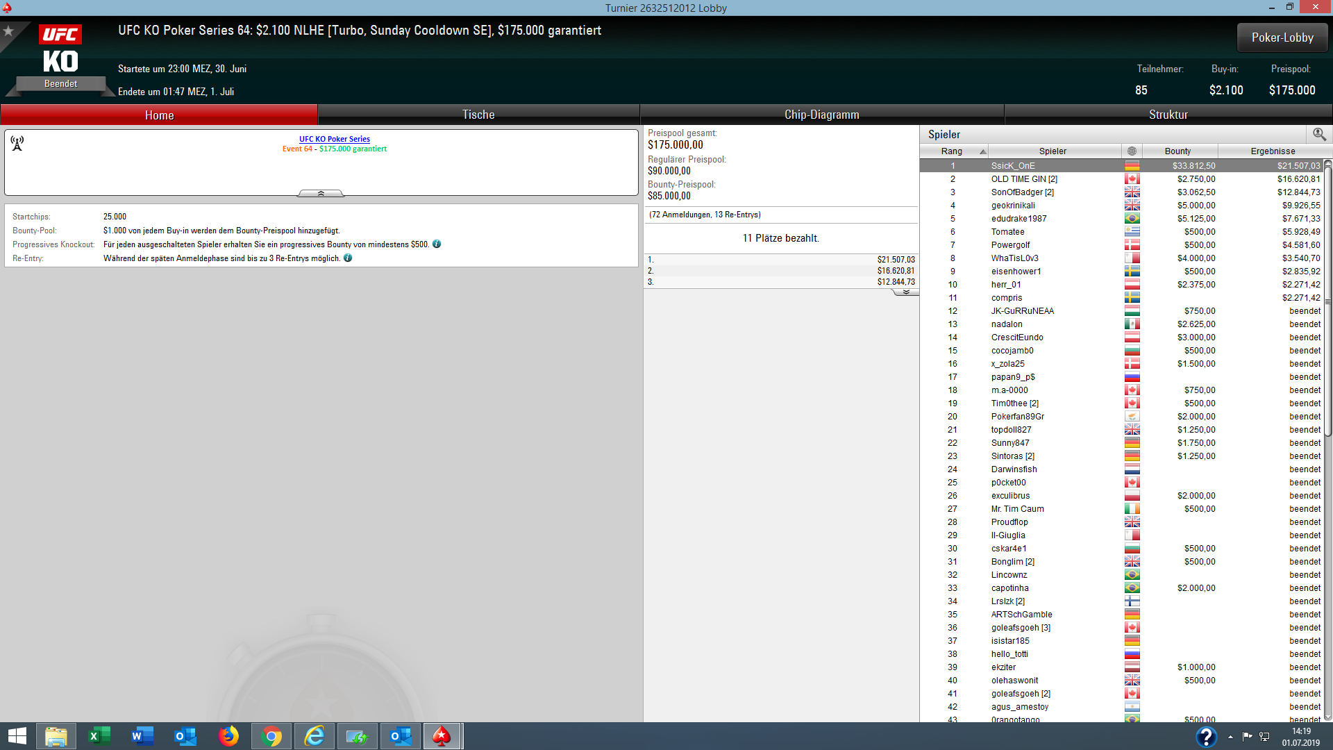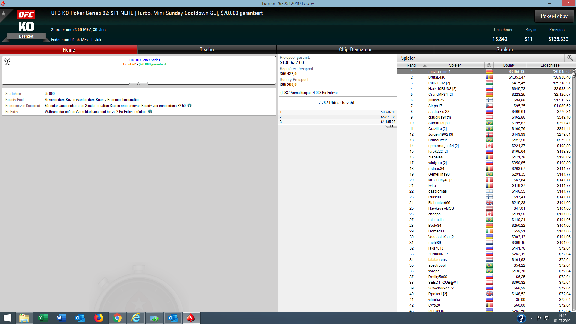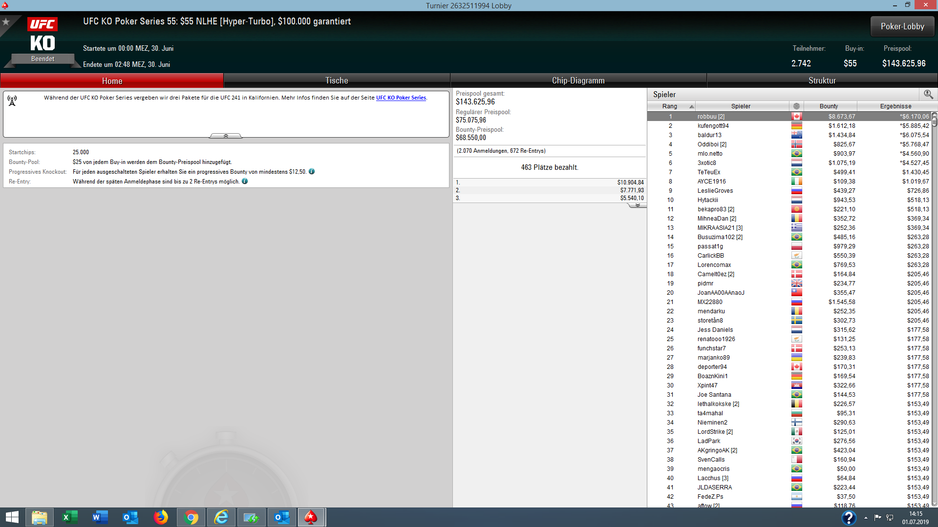 Bei der günstigen $11 Version des Turniers (UFC Event #62) ging der Sieg und $6.045 + $3.655 Bounties ebenfalls nach Deutschland an „mrcharming“.