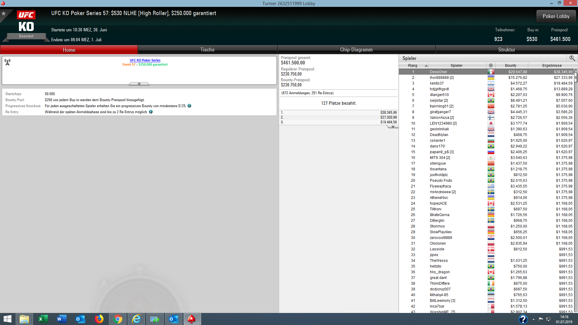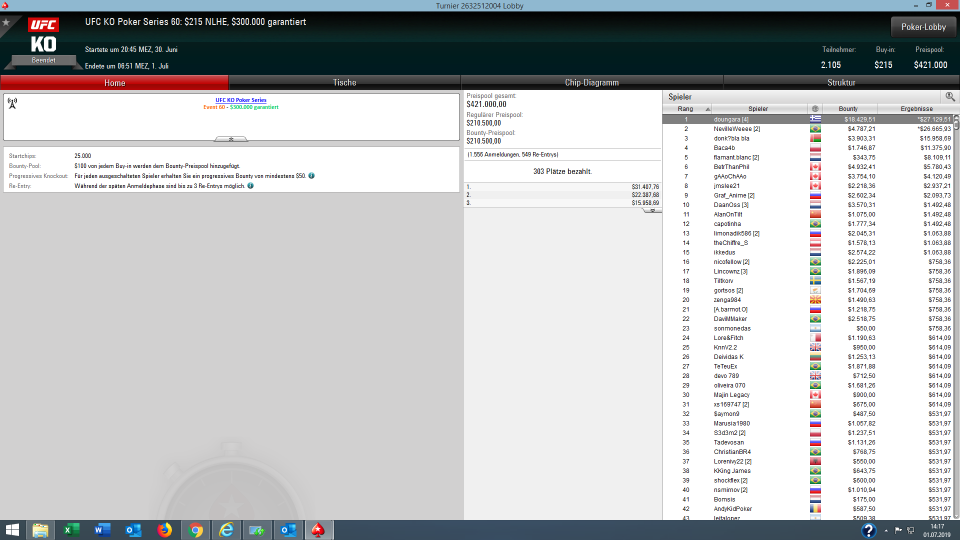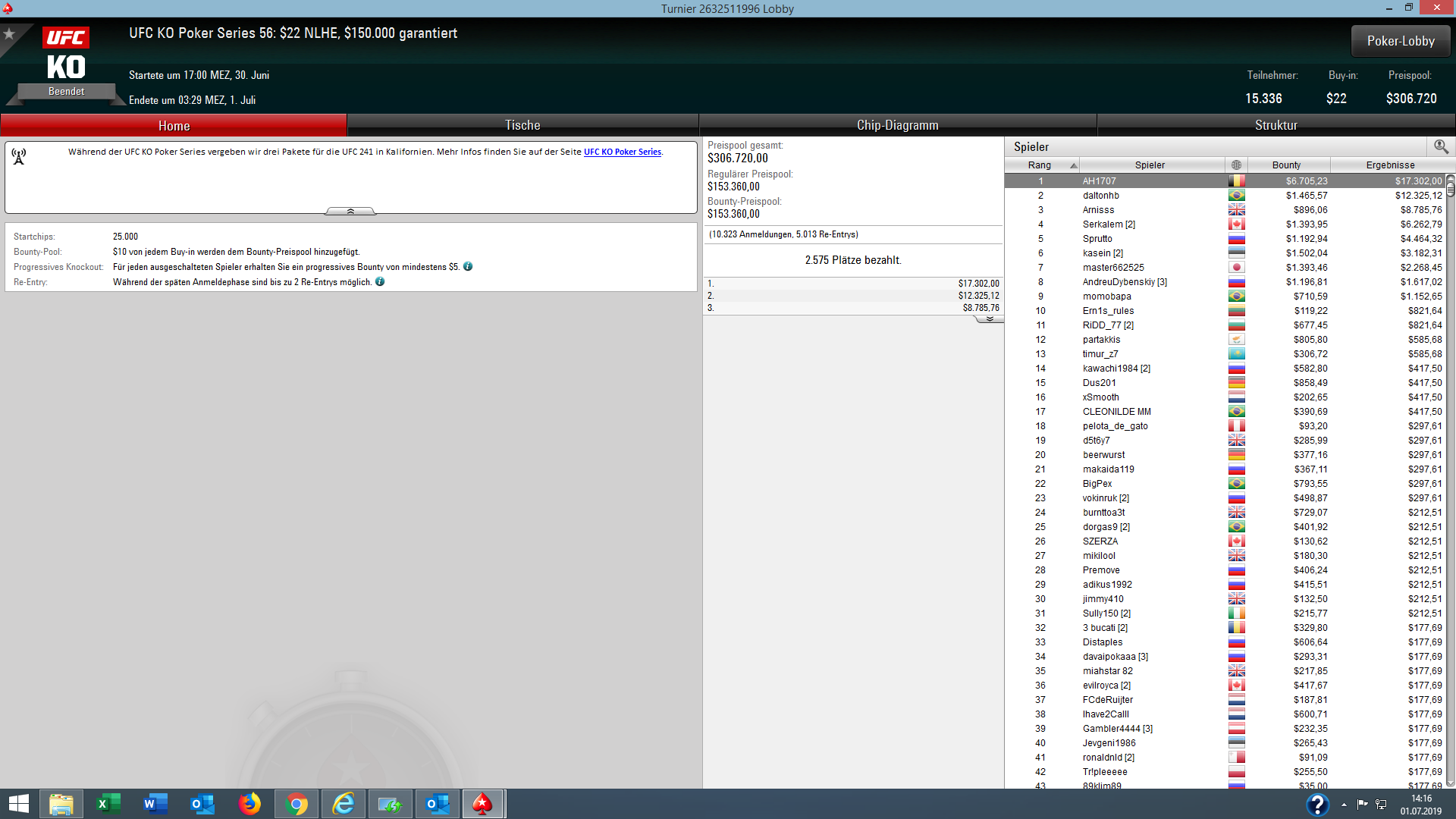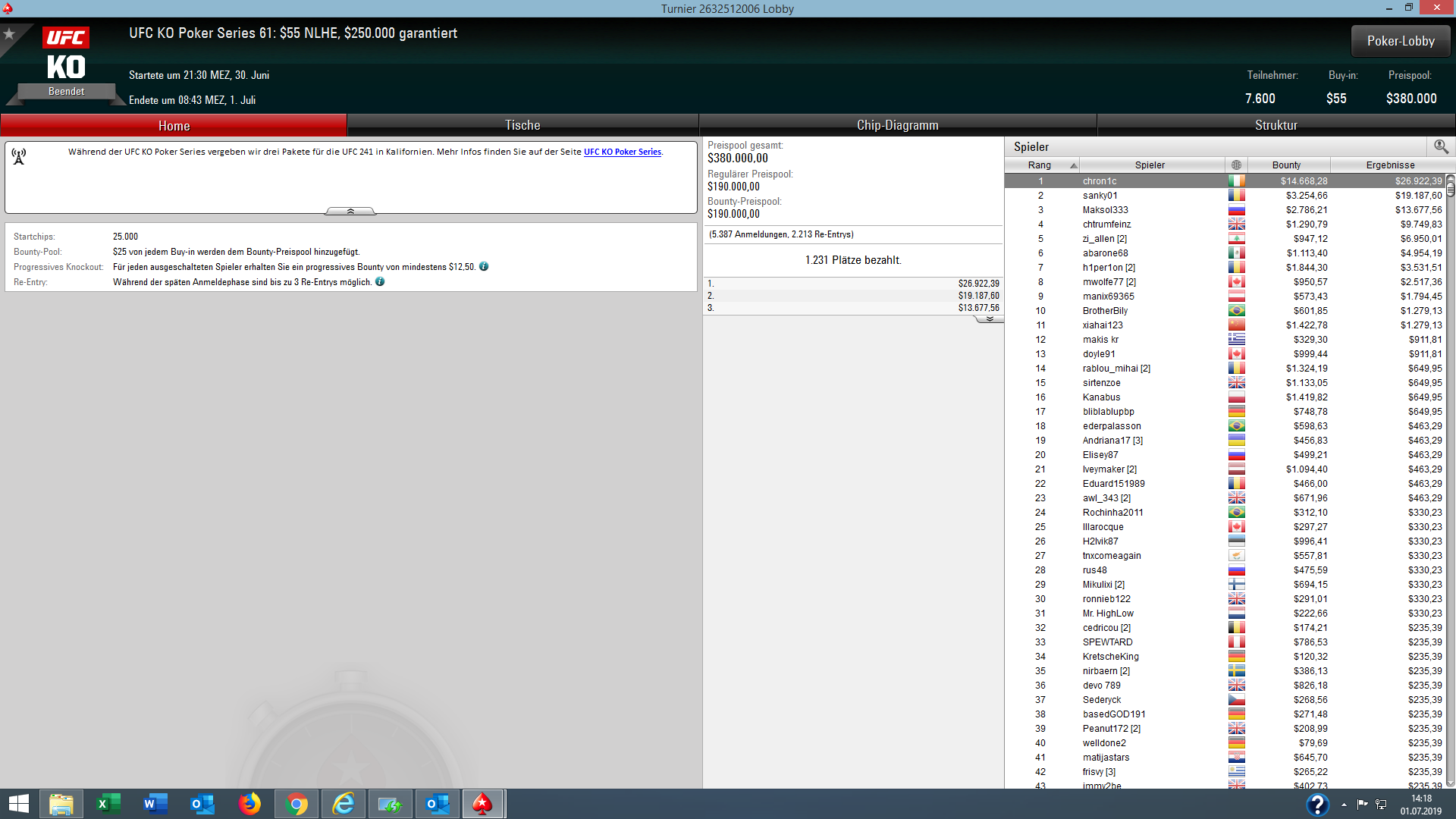 Bei der günstigen $11 Version des Turniers (UFC Event #62) ging der Sieg und $6.045 + $3.655 Bounties ebenfalls nach Deutschland an „mrcharming“.