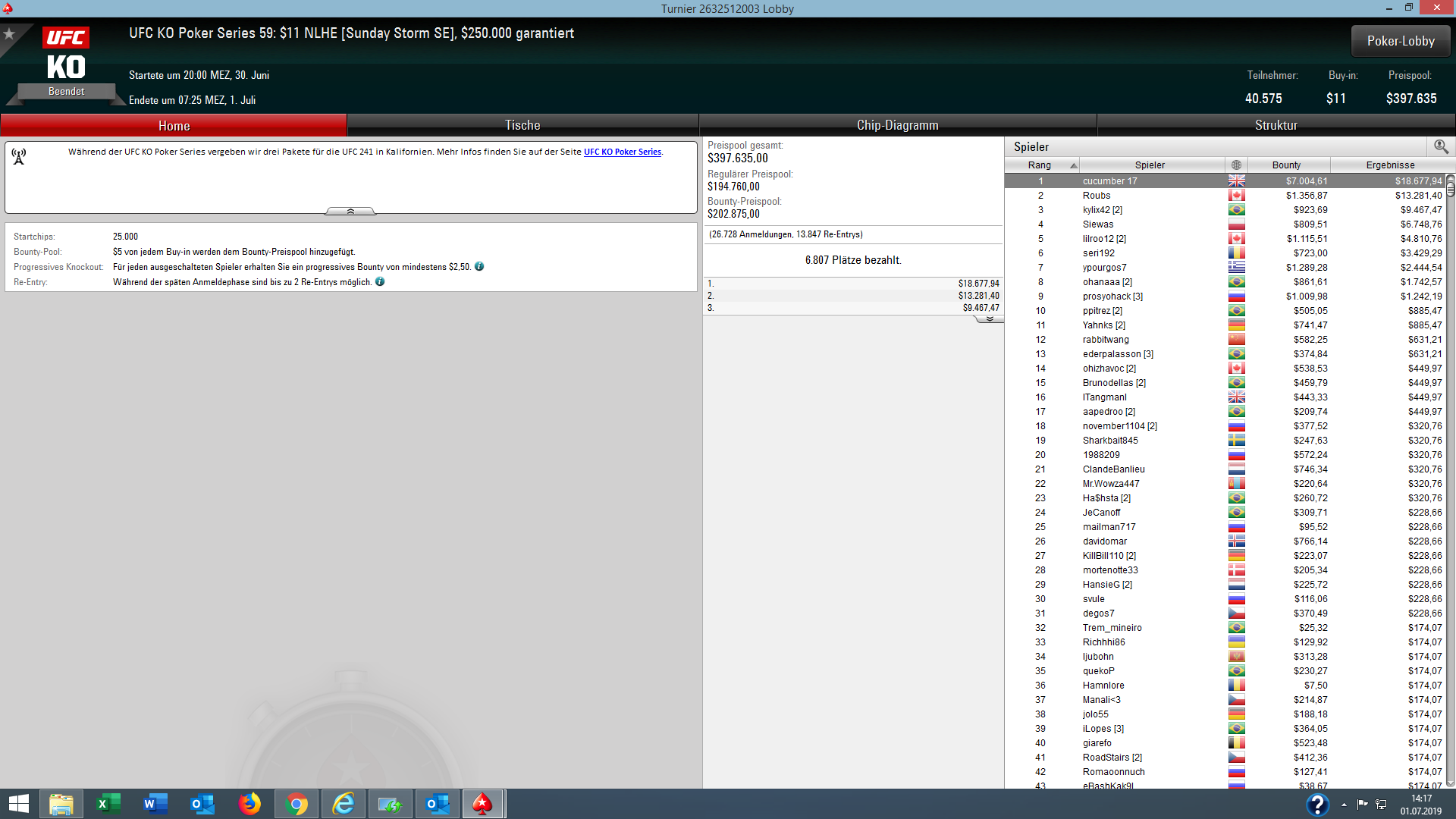 | UFC KO (59): $11 NLHE Sunday Storm SE | cucumber 17 | Großbritannien | $18.677,94/$7.004,61 |