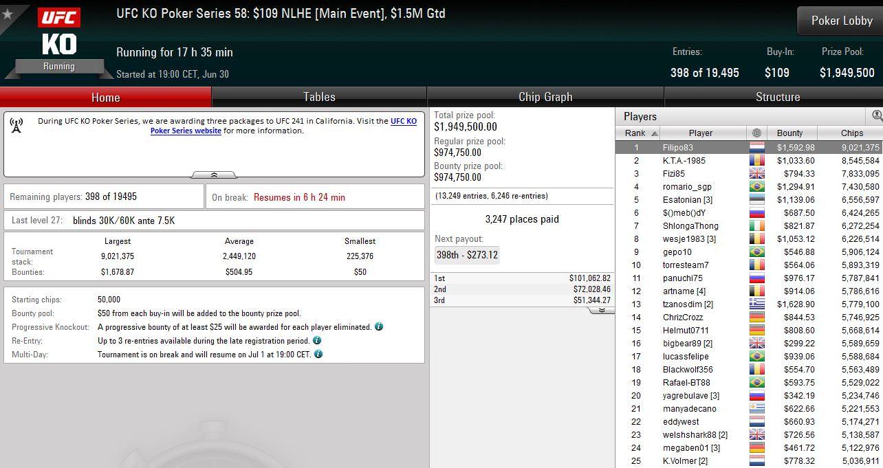 Am Sonntag kam es auf PokerStars zum großen Showdown beim Finale der PokerStars UFC KO Poker Series. Alle freuten sich auf den $109 Main Event bei dem $1.500.000 garantiert waren. Am Ende wurden es sogar 19.495 Entries und der Preispool wuchs auf $1.949.500 an. 3.247 Online-Grinder sollten es in die Geldränge schaffen. Bei noch 398 Akteuren im Turnier wurde Tag 1 beendet. Im Finale am Montag warten $101.062 auf den Champion. Den Chiplead hält der Franzose „Filipo83“ mit 9.021.375. Von den DACH-Spielern haben „ChrizCross“ (GER – Rang 14 – 5.746.925) und „Helmut0711“ (GER – Rang 15 – 5.668.614) die beste Ausgangsposition.