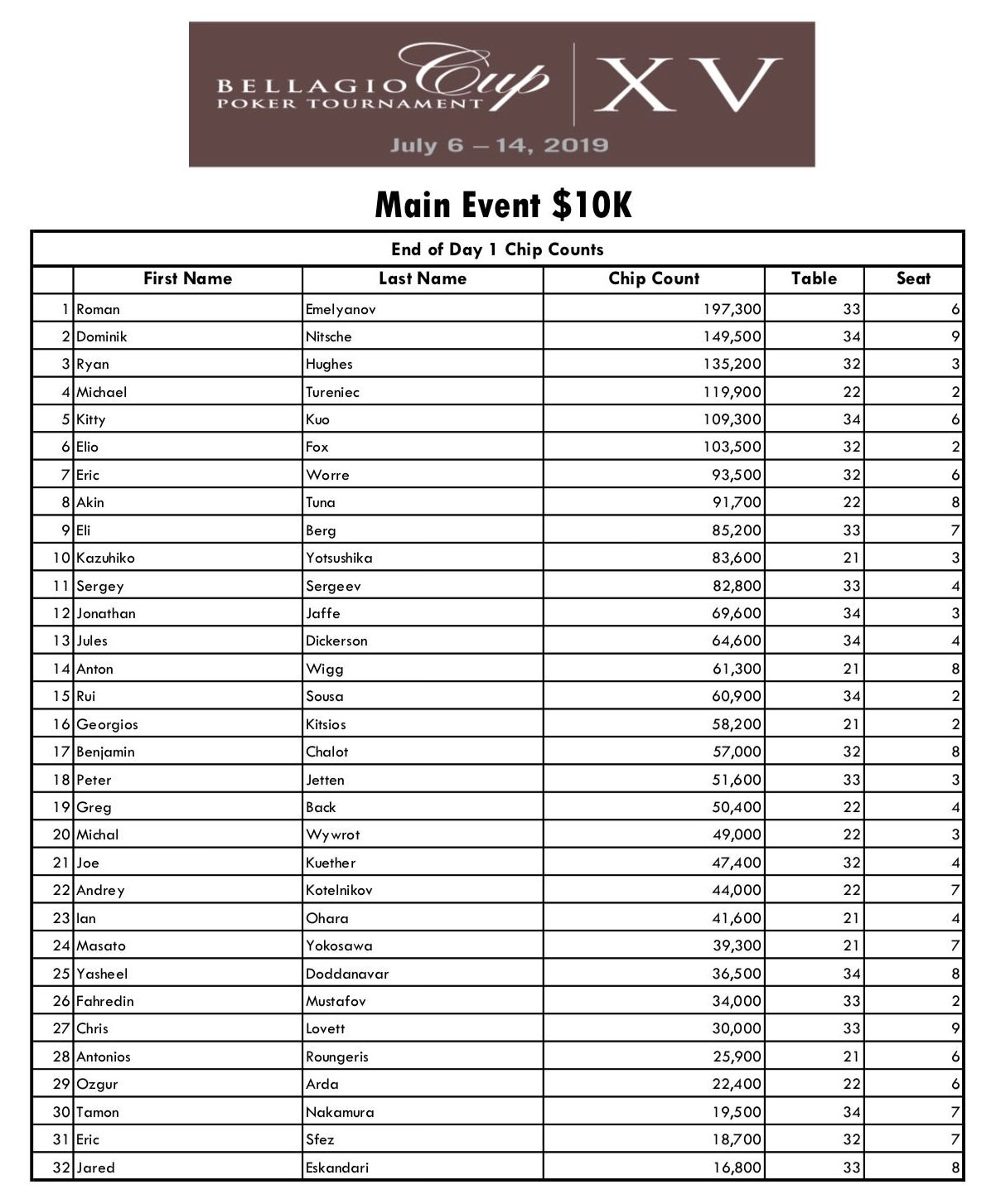 Ein weiteres Highlight im Poker-Sommer ist der Bellagio Cup. Am Starttag des Main Events zahlten 43 Spieler den Buy-In von $10.400, von denen 32 den Tag nach 5 Level überlebten und Chips eintüten durften. Mit 50.000 Chips und 90 minütigen Blind-Level war ausreichend Spielraum geboten. Die Late Registration ist noch bis Level 13 an Tag 3 geöffnet, sodass noch einige Entries zu erwarten sind.