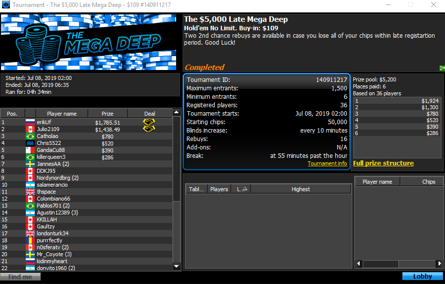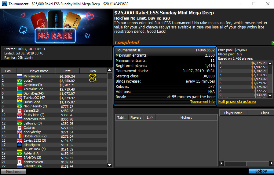 Das $20 RakeLESS Sunday Mini Mega Deep wurde ebenfalls durch einen Deal beendet. Mr. Pampers aus Russland sicherte sich den Sieg und $6.309,34. Platz zwei belegte guds7 aus Brasilien für $5.450,02.