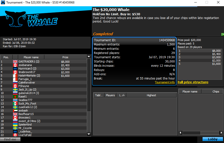 Beim teuersten Turnier des Abends, dem $530 Whale, reichten 29 Entries und 8 Rebuys nicht um die garantierte Summe von $20.000 zu knacken. Der Sieg und $8.000 gingen an GASTRADER1 aus Großbritannien. Ivan „hurrrrican3“ Gabrieli musste sich mit Rang 3 und $3.000 zufrieden geben.