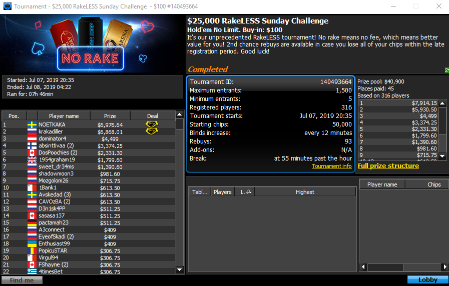 Bei der $100 RakeLESS Sunday Challenge sprengten 316 Spieler und 93 Rebuys den garantierten Prizepool und so sollten $40.900 ausgeschüttet werden. NOETKAKA aus Schweden ($6.976,64) und krakadiller aus Russland ($6.868,01) teilten sich den Sieg. Der Österreicher dominator4 ($4.499) beendete das Turnier auf Rang 3.