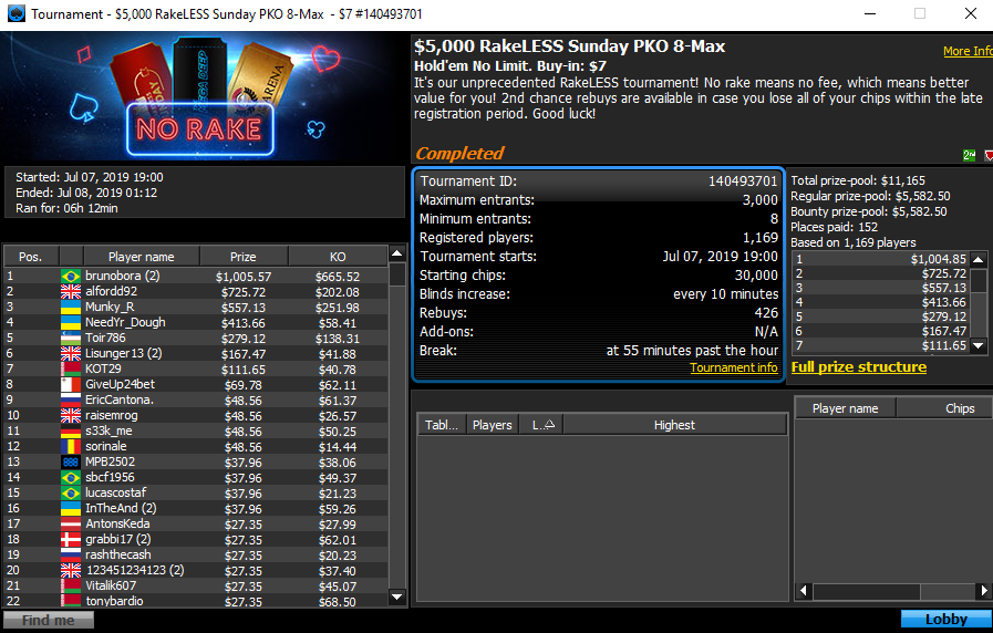 Ein weiterer Brasilianer war beim $7 RakeLESS Sunday PKO erfolgreich. brunobora erhielt für seinen Sieg $1.671,09 ($1005,57+665,52 Bountys).