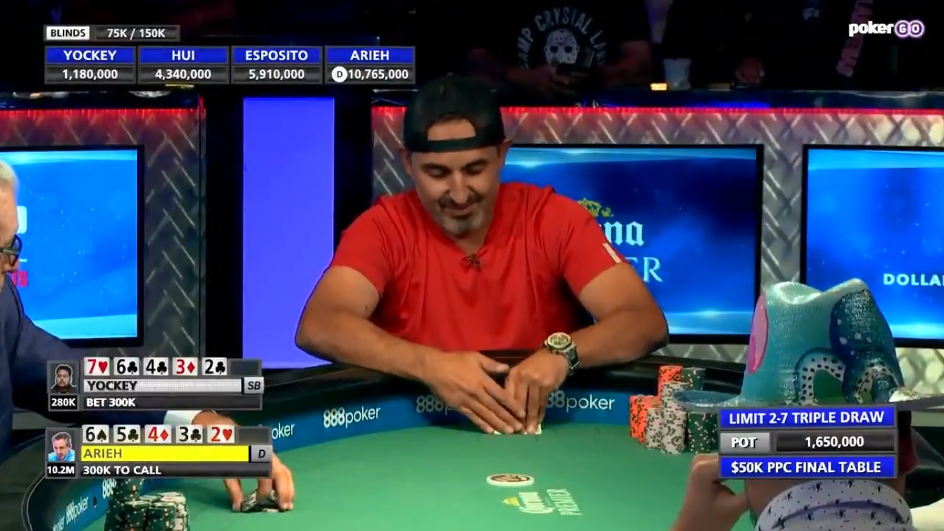 Als Shortstack der letzten vier Spieler bekam Bryce Yockey bei Deuce to Seven Triple Draw mit 76432 direkt die zweitbeste Hand überhaupt ausgeteilt und hatte damit beste Chancen, etwas Boden gut zu machen.