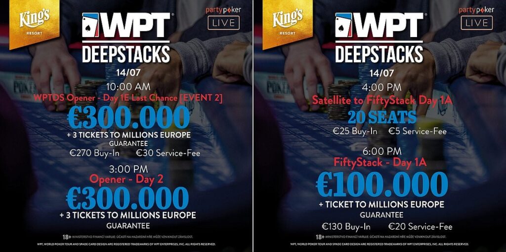 | Fri 19.07. 13:00 | Satellite to WPTDeepStacks Rozvadov | 15.000 EUR | 180 EUR | 20 EUR |