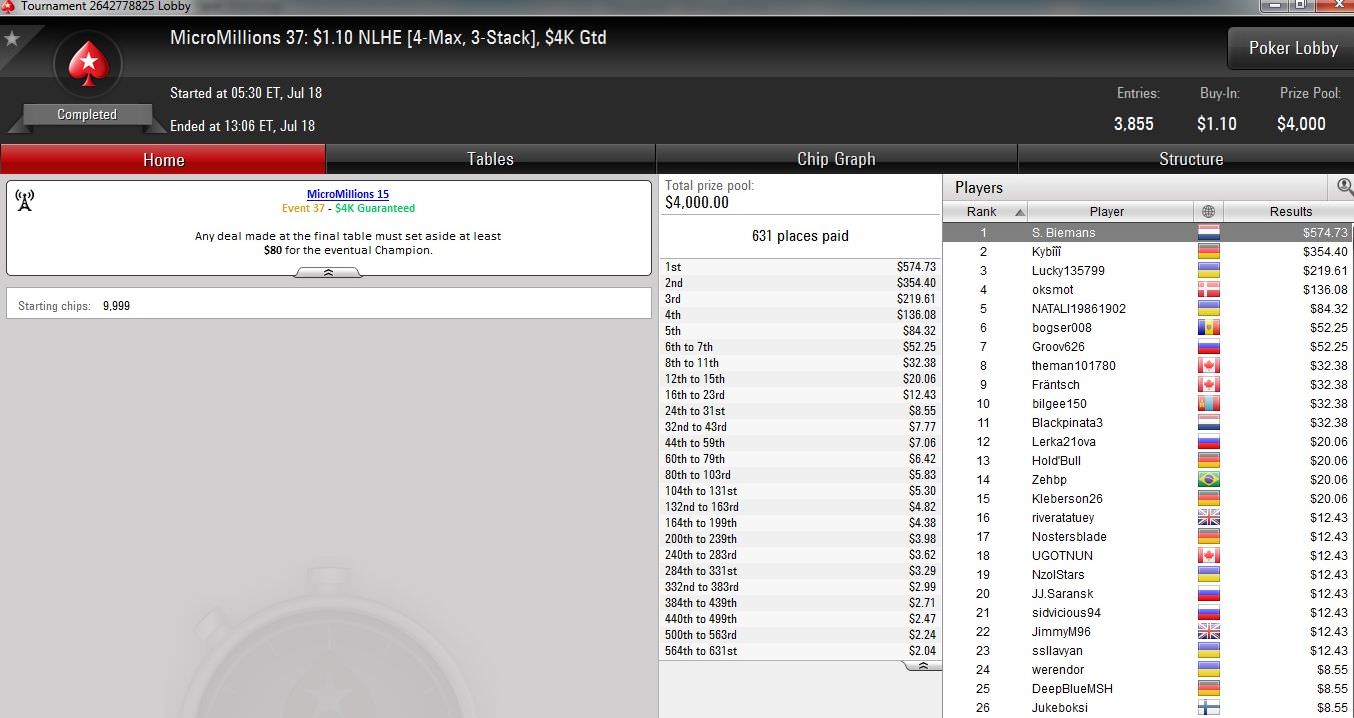 Um ein Haar hätte „Kybîîî“ bei Event 37, einem $1.10 NLHE, noch einen weiteren Sieg eingefahren, hinter „S. Biemans“ aus den Niederlanden reichte es aber „nur“ zum zweiten Rang.