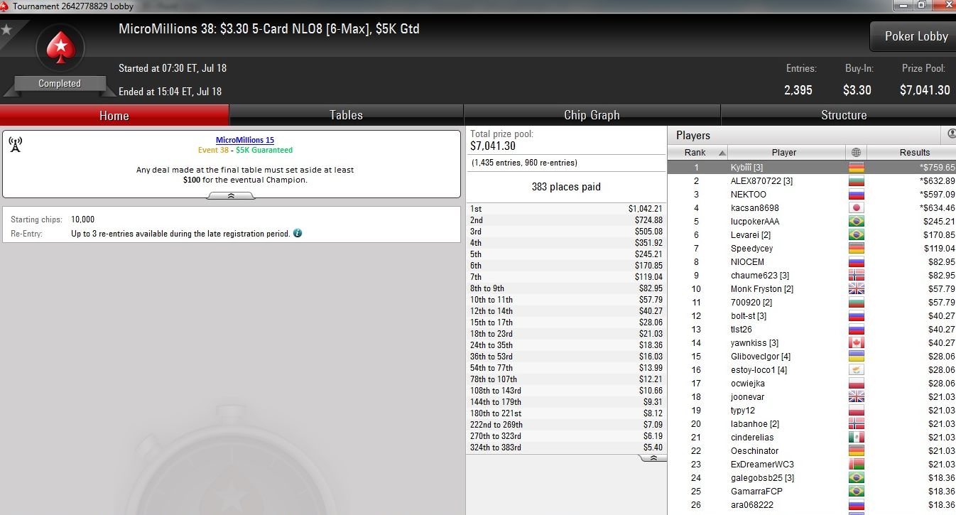 Bei Event 38, einem $3.30 Five Card No-Limit Omaha, setzte sich „Kybîîî“ aus Deutschland gegen 2.394 Konkurrenten durch und kassierte nach einem Deal der letzten vier Spieler knapp $760 Preisgeld.