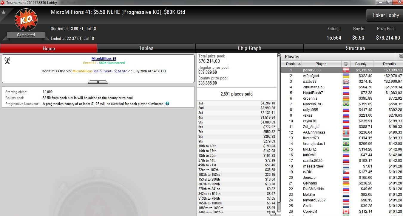 Größter Gewinner des Tages war der Däne „poker2350“, der bei Event #41, einem $5.50 Progressive Knockout, mit Bounties über $4.700 abräumte.