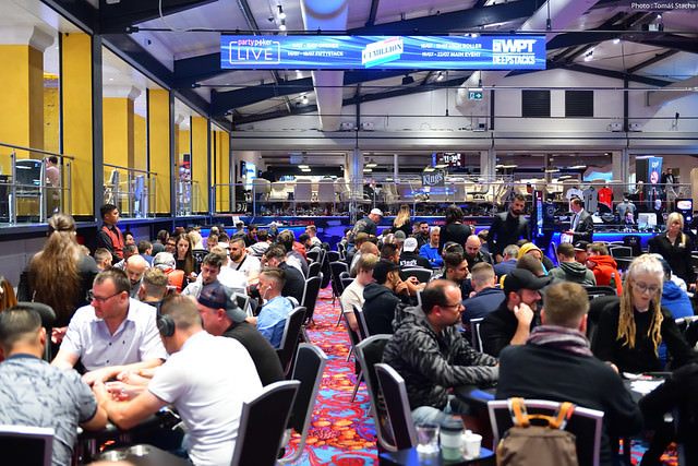 Am Sonntagmorgen gab es im King’s Resort Rozvadov die letzte Möglichkeit beim Tag 1c in den €1.350+€150 World Poker Tour Deepstacks Germany Main Event powered by partypoker einzusteigen. Der Tag 1c wurde als Turbo Flight mit einer Startdotation von 30.000 und 13 Level à 40 Minuten gespielt. Hier durfte man noch 78 Entries verbuchen und so kommt man auf insgesamt 371 Starts und der Veranstalter musste ein Overlay von fast €75.000 hinnehmen. Das garantierte Preisgeld von €500.000 (abzüglich Tournament Fee €472.425) sollte unter den besten 45 ausgespielt werden. Der Min-Cash brachte €2.525 und auf den Champion warten am Montag €97.670. Außerdem bekommen die Top Fünf jeweils ein €10.300 partypoker MILLIONS Europe Main Event Ticket. Tag 1c überstanden schließlich 35 Spieler, darunter auch bekannte Namen wie Robert Zipf, Tobias Peters und Bracelet-Champion „German Schnitzel“.