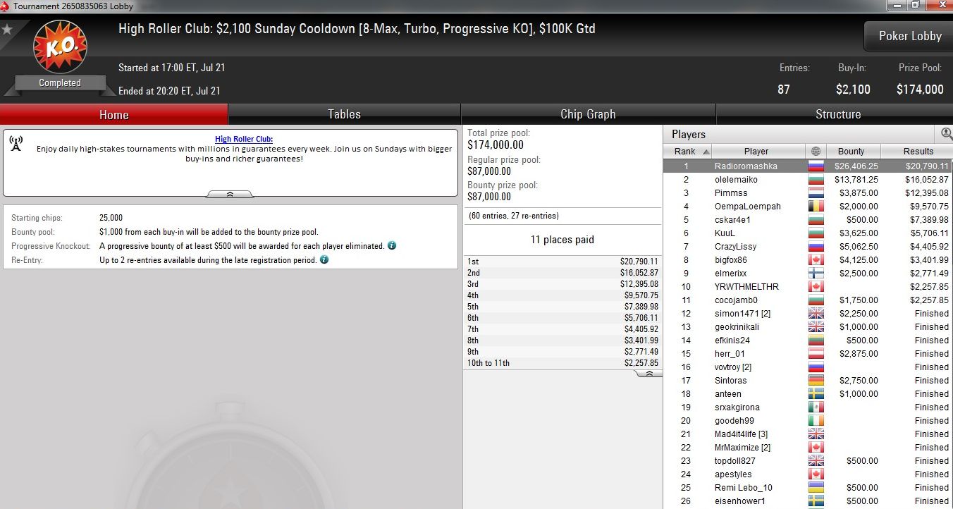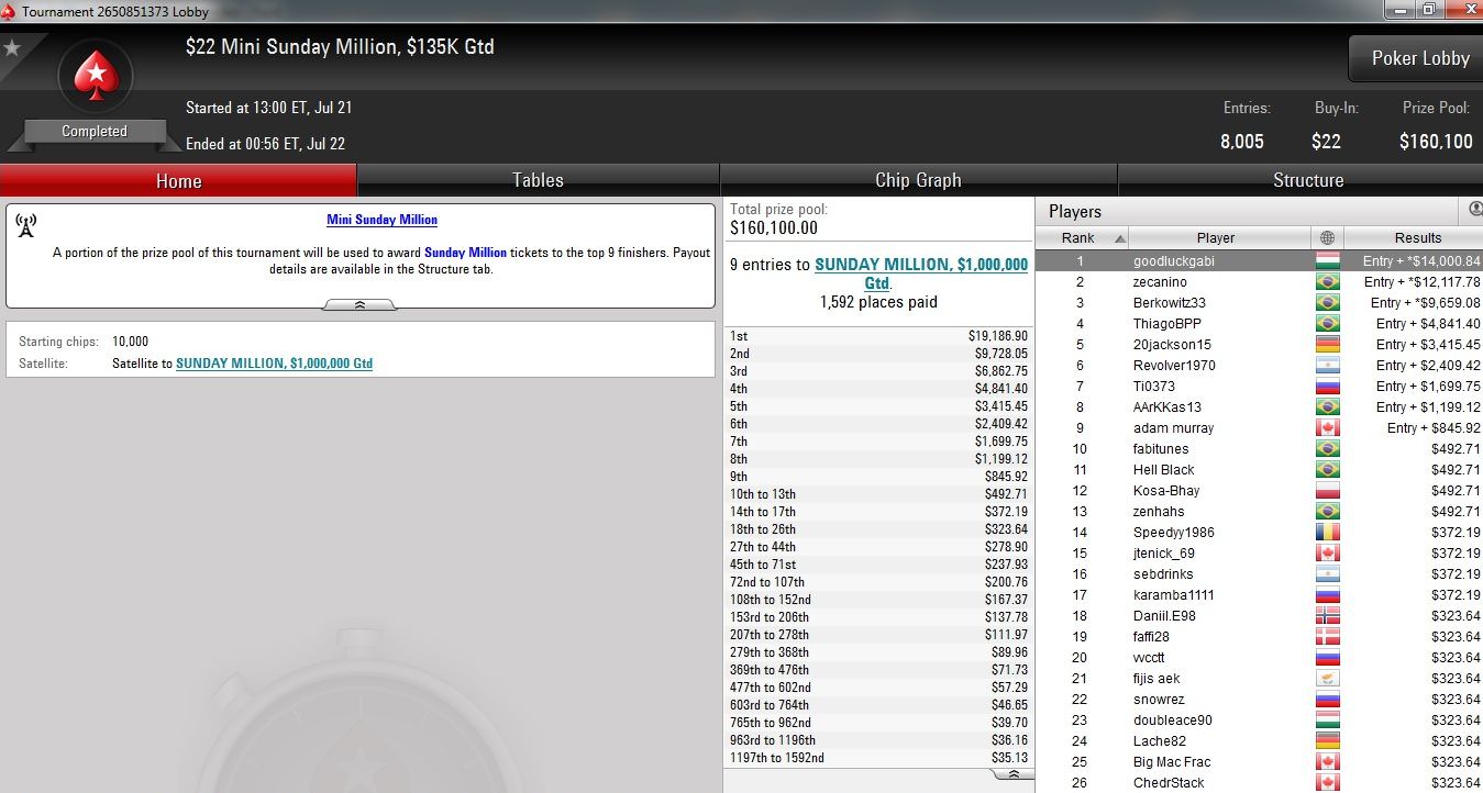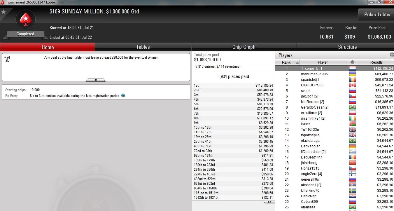 Den größten Cash des Tages holte Conor „1_conor_b_1“ Beresford. Der Brite holte sich ohne vorherigen Deal die Sunday Million und durfte sich über ein Preisgeld von mehr als $112.000 freuen.