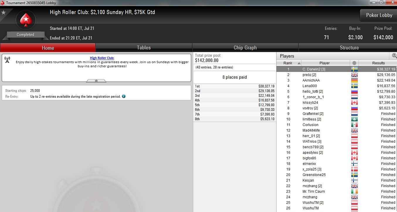 Auch Simon „C. Darwin2” Mattsson schlug wieder einmal zu. Der erfolgsverwöhnte Schwede ließ beim $2.100 Sunday Highroller sämtliche Kontrahenten hinter sich und bekam dafür gut $38.000 – allerdings hatte er sich vorher auch dreimal eingekauft.