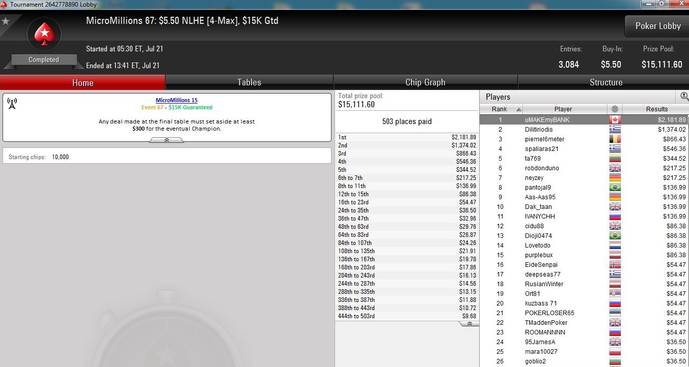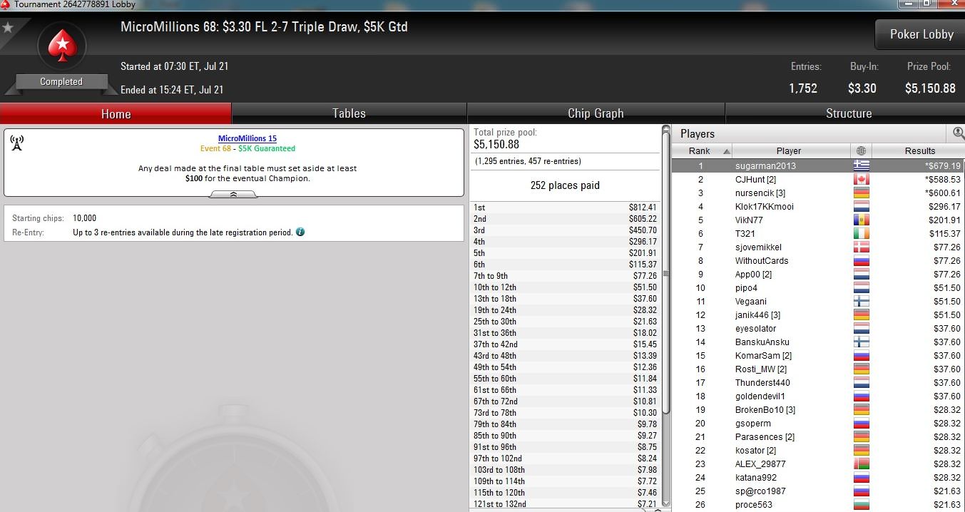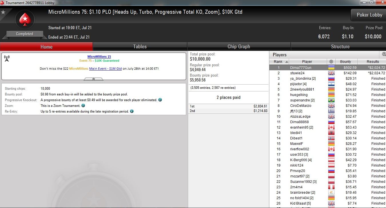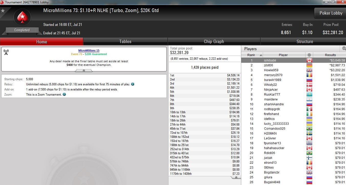 Das beste Ergebnis erzielte „zibit06“, der bei Event #73, einem $1,10 Turbo Zoom, nach Deal auf Platz 2 landete. Dafür gab es mit $3.000 Preisgeld eine üppige Summe für ein Turnier mit diesem Startgeld.