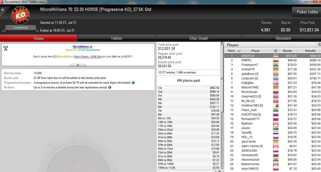 Auch heute stehen bei den MicroMillons wieder zehn Turniere an, die Buy-Ins betragen zwischen $1.10 und $5.50. Die Turnierserie dauert noch bis Sonntag