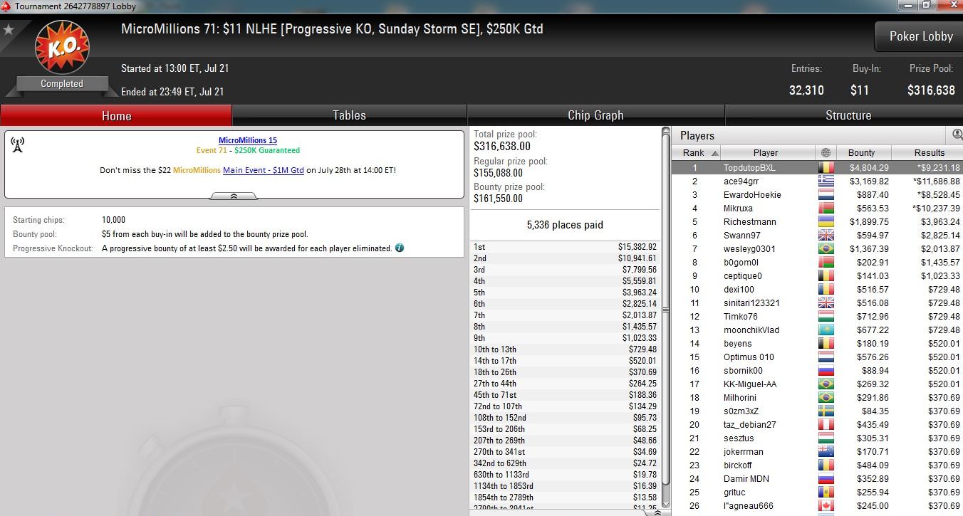 Nach knapp elf Stunden endete das Turnier mit dem Sieg des Belgiers „TopdutopBXL“, der allerdings mit drei anderen Spielern vorher einen Deal geschlossen hatte. Mit einem Preisgeld von rund $14.000 war er gemeinsam mit dem Griechen „ace94grr“, der fast $15.000 abräumte, der große Gewinner.