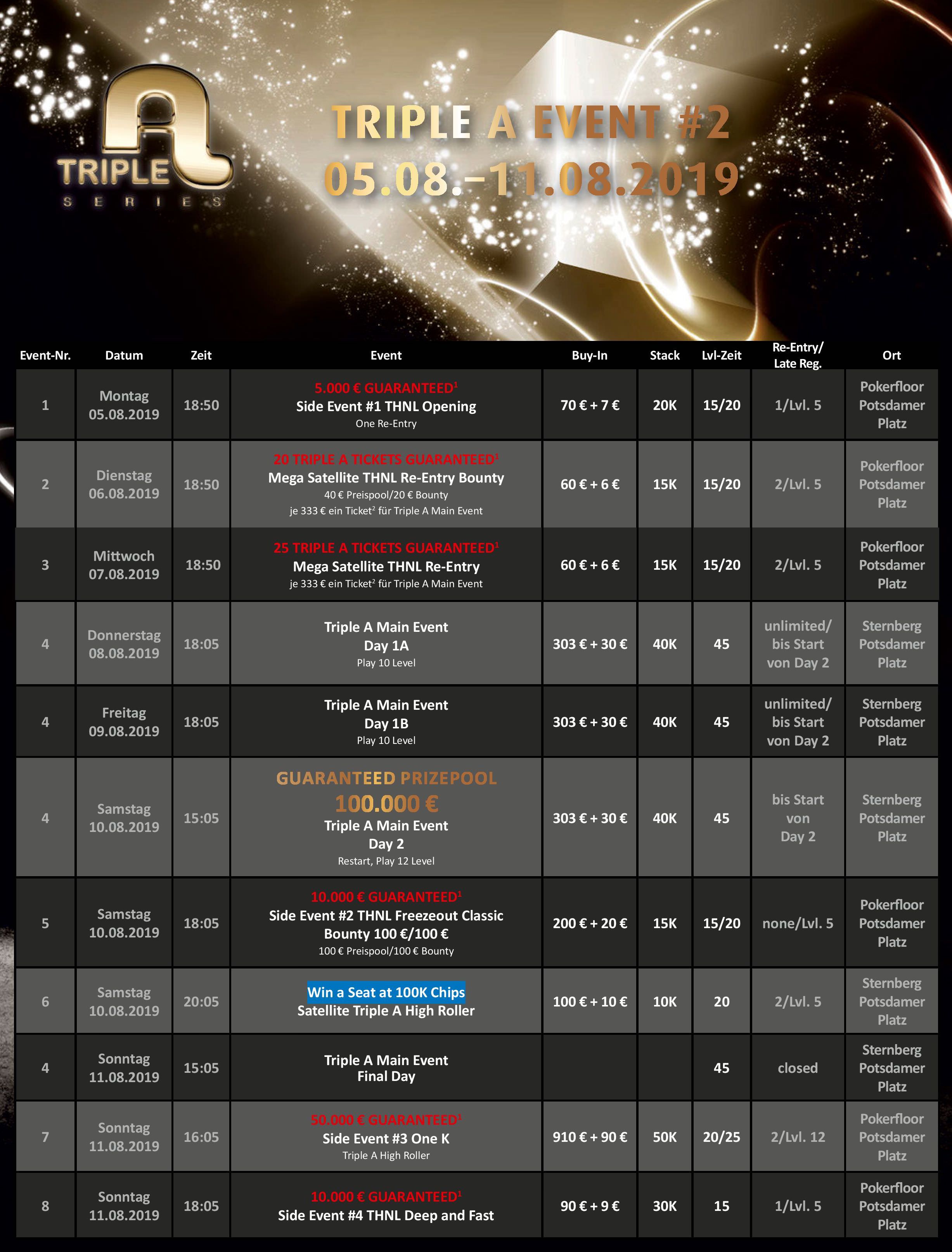Ab Montag den 05. August geht es dann bereits mit den nächsten Poker-Highlight in Berlin weiter. Insgesamt gibt es bei der „Triple A Series“ in der Spielbank Berlin fünf Turniere mit Buy-Ins zwischen €77 und €1.000. Insgesamt werden Preisgelder von €175.000 garantiert. Außerdem werden bei den zwei Main Event Satellites für ein Buy-In von jeweils €66 insgesamt 45 Tickets garantiert. Das Highlight der Woche ist natürlich der €303+€30 Triple A Series Main Event vom 08.- 11. August, bei dem es mindestens um €100.000 gehen wird. An den Starttagen Eins geht es mit 40.000 in Chips los und die Blinds werden alle 45 Minuten erhöht. Es sind unlimited Re-Entries erlaubt und die Late-Registration ist bis zum Start von Tag 2 (Samstag 15:05 Uhr) geöffnet.