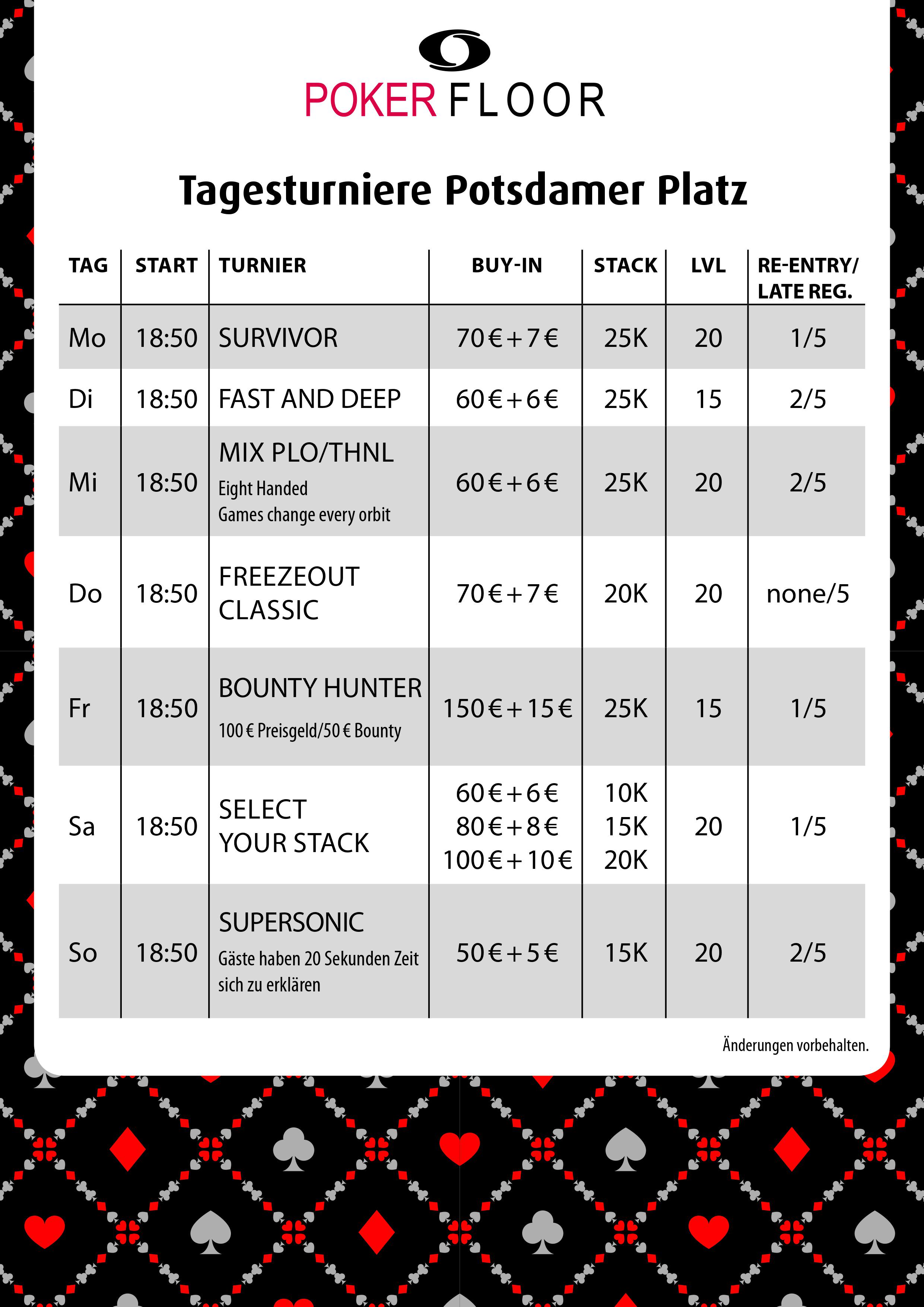 Am Montag startet die Woche wie gewohnt um 18:50 Uhr mit dem €70+€7 Survivior Event. Hier gibt es 25.000 in Chips und jeder Level dauert 20 Minuten. Ein Re-Entry ist möglich und die Late-Registration ist für fünf Level geöffnet.