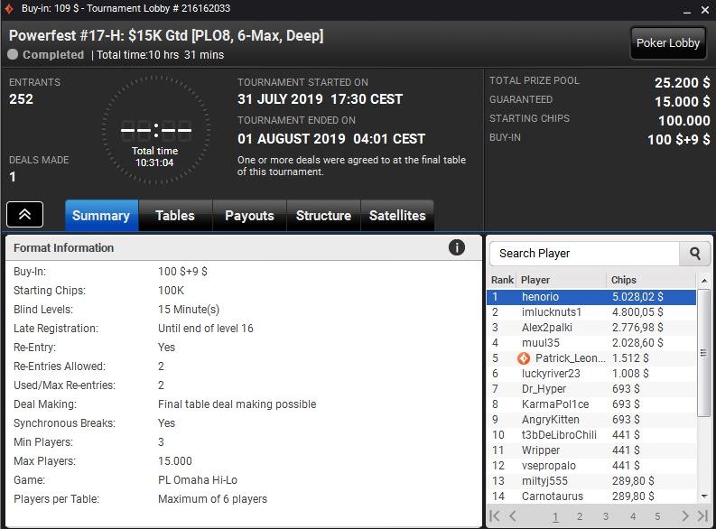 | 1. August 2019 | 20:00 | Powerfest #23-High Roller: $100K Gtd [PLO,][6-Max] | $1050 |