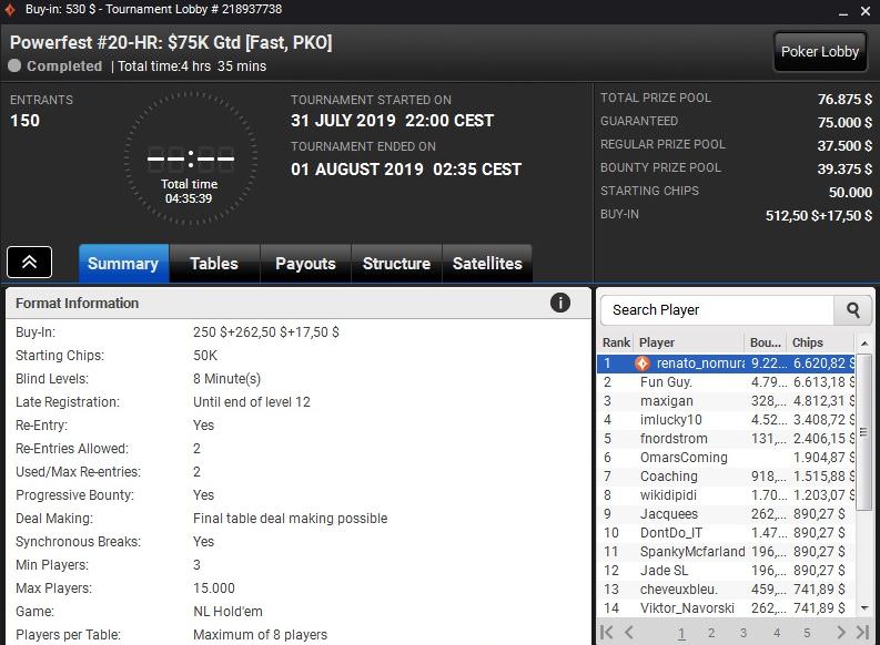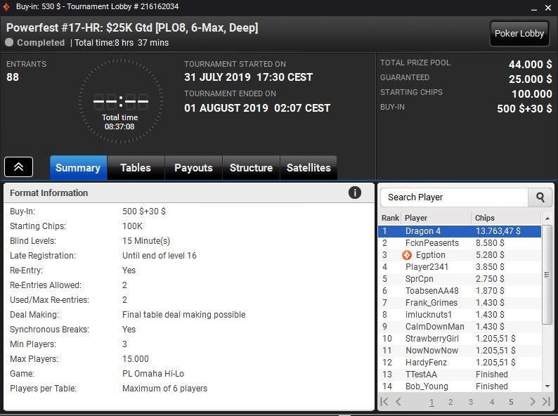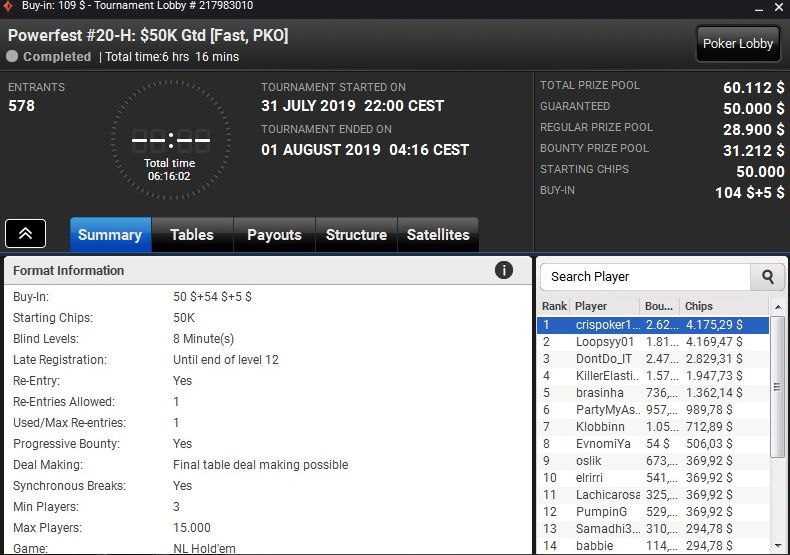 | 1. August 2019 | 20:30 | Powerfest #25-High Roller: $50K Gtd [Deep,][Turbo] | $530 |