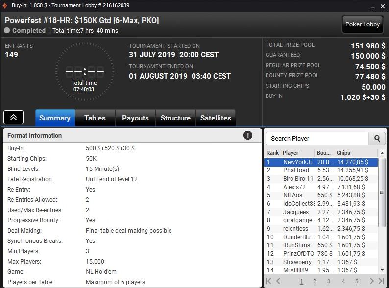 | 1. August 2019 | 20:00 | Powerfest #24-H: $150K Gtd [PKO] | $320 |