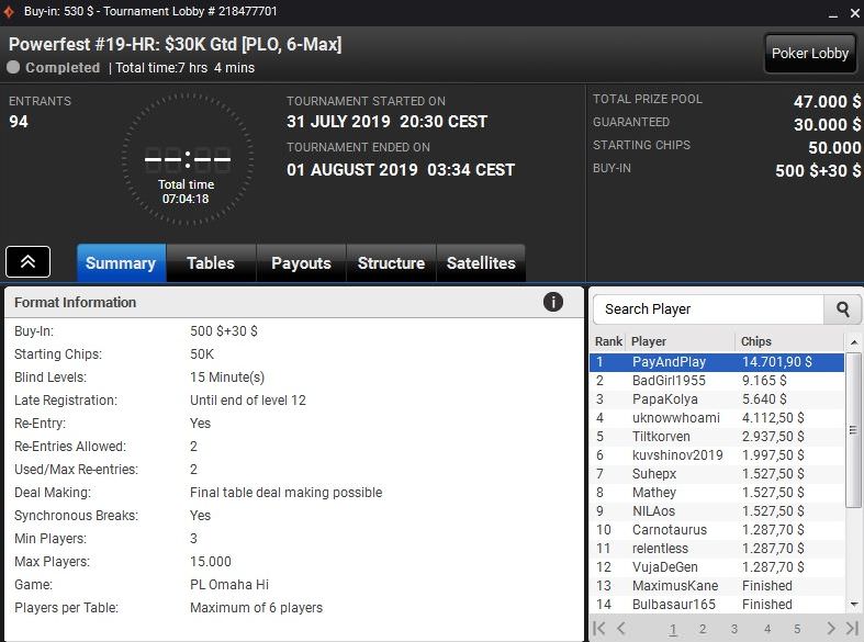 | 1. August 2019 | 22:00 | Powerfest #26-M: $20K Gtd [6-4][Mix-Max,][Fast,][PKO] | $22 |