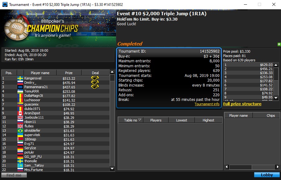 Beim $3,30 Triple Jump wurden in Summe 639 Entries bezahlt und somit lagen $3.330 im Preispool. Nach einem 3-Way Deal durfte sich der Schwede „Kangerovel“ über einen Titel und $513,22 freuen. Der Russe „Dmitry_“ erhielt für Platz 2 $470,94 und „Panmanmara21“ für Platz 3 immerhin noch $437,65.