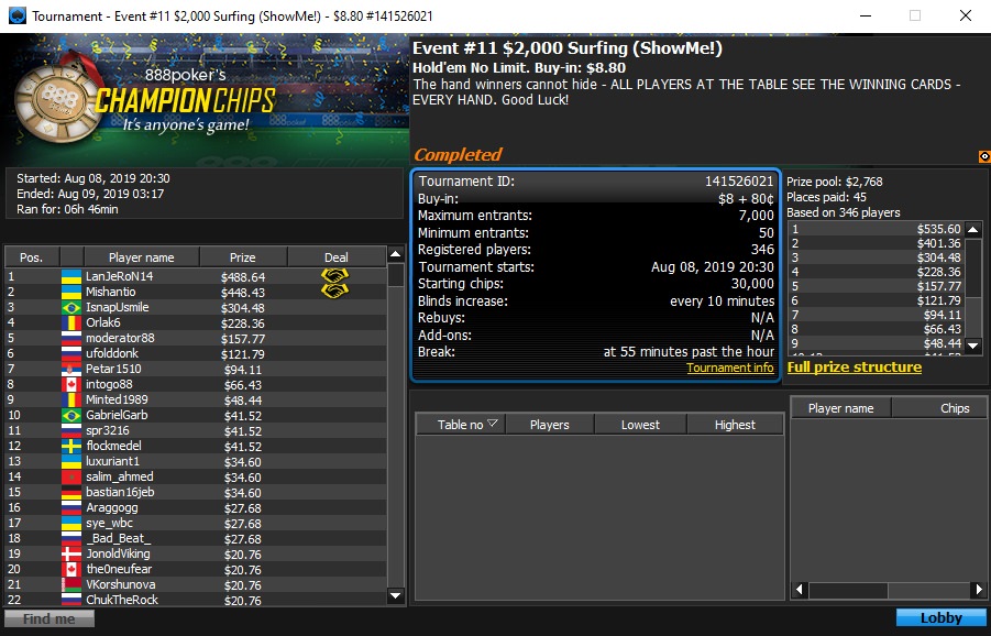 Das zweite Event des Tages war das $8,80 Surfing und mit 346 Entries lagen $2.768 im Preispool. Auch bei diesem Turnier kam es zum einem Deal, dieses Mal aber erst im Heads-Up. Als offizieller Sieger erhielt „LanJeRoN14“ $488,64 und der Runner-Up „Mishantio“ ebenfalls aus der Ukraine konnte $448,43 verbuchen.