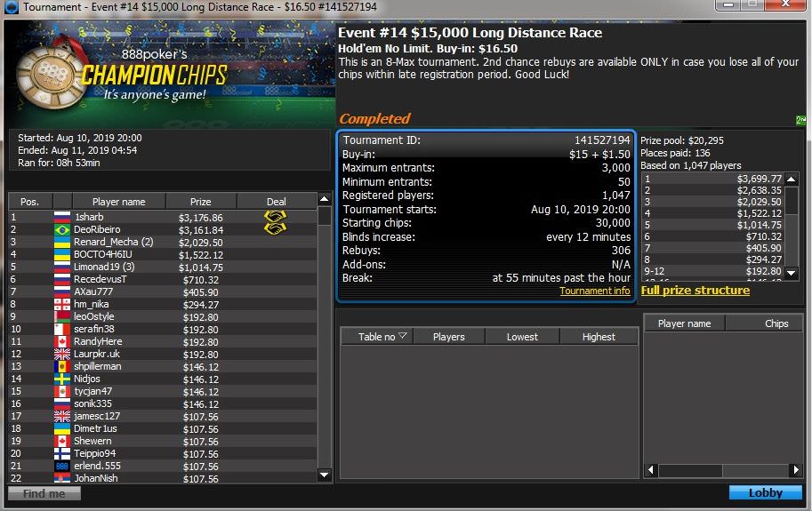 Bei Event #14, dem $16,50 Long Distance Race, meldeten sich mit Rebuys 1.353 Spieler an und sorgten so für einen Preisgeldtopf von über $20.000.