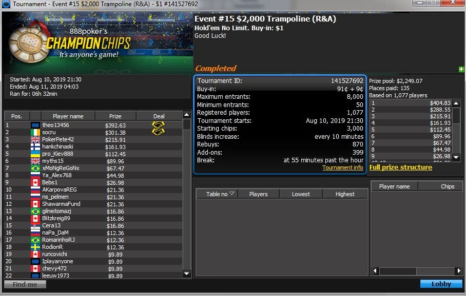 Etwas kleiner ging es bei Event #15, dem $1 Trampoline zu. Hier wollten 1.947 Entries mithüpfen, womit es am Ende um knapp $2.250 Preisgeld ging.