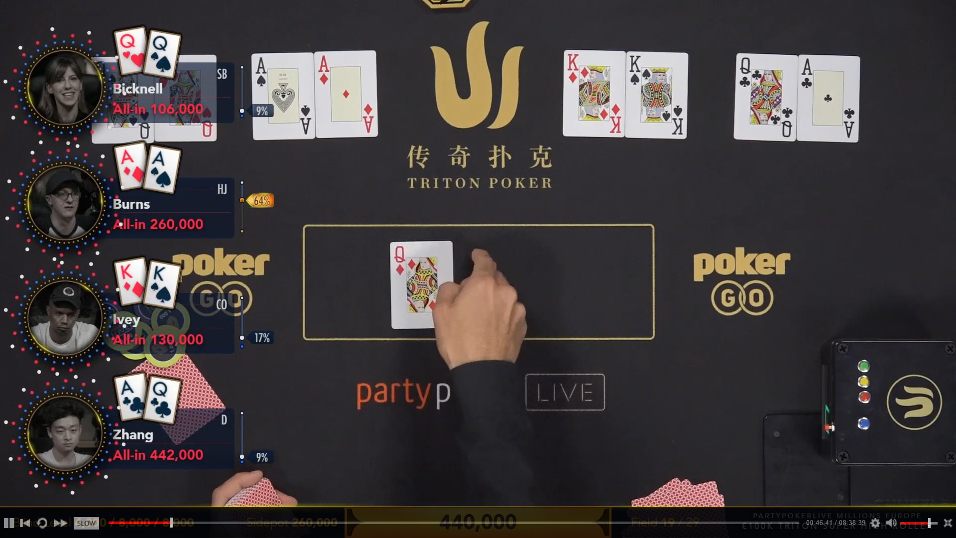und bedeutet für die Spielerin aus dem Team partypoker das Quadruple-Up! Der Side-Pot geht an Kahle Burns, und Phil Ivey geht an die Turnierkasse, um ein Re-Entry zu nehmen.