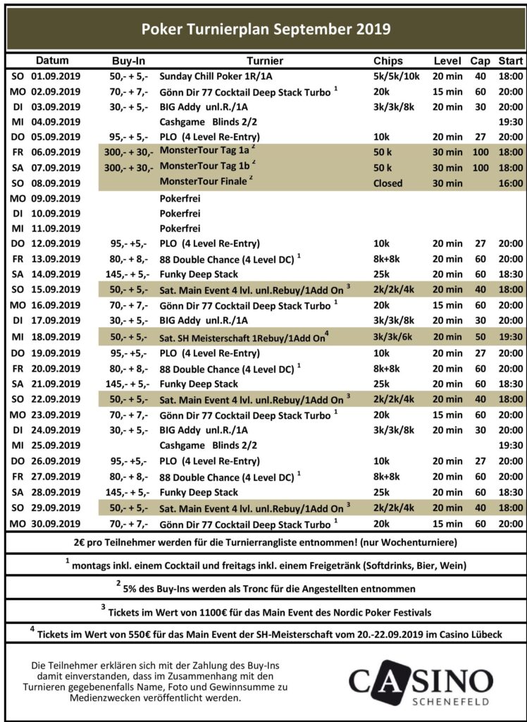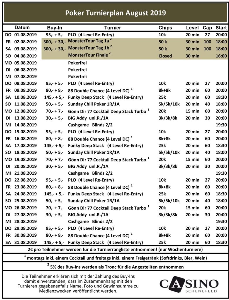 Im Casino Schenefeld warten in den kommenden Tagen einige spannende Turniere auf Spieler aus dem Hamburger Raum. So findet beispielsweise am Donnerstag ein spannendes PLO-Turnier statt und am Freitag gibts Action beim “88 Double Chance”. Unten gibt es den gesamten Turnierplan für August und September.