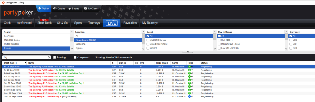 Jeden Tag hat man also die Chance auf 20 garantierte €320-Satellite-Tickets sowie 5 garantierte €2.350-Main-Event-Tickets. Wer den virtuellen Starttag übersteht, kann direkt in Tag 2 am Samstag, den 15.09. im King’s Resort in Rozvadov einsteigen.