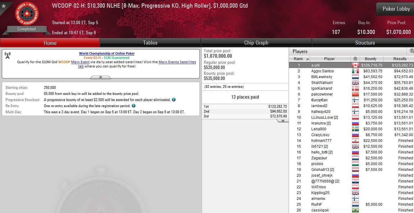 Größter Gewinner des ersten Finaltags war aber der Kanadier „a.urli“, der sich die Highroller-Variante von Event #2 unter den Nagel riss und fast genau $250.000 kassierte.