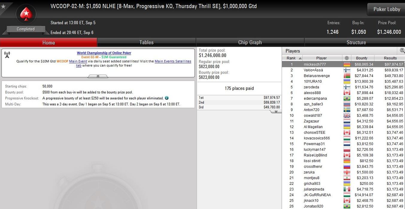 Aus deutschsprachiger Sicht konnte es fast nicht besser losgehen, da „mickesch777“ das als Event #2 deklarierte $1.050 Thursday Thrill für sich entscheiden konnte.