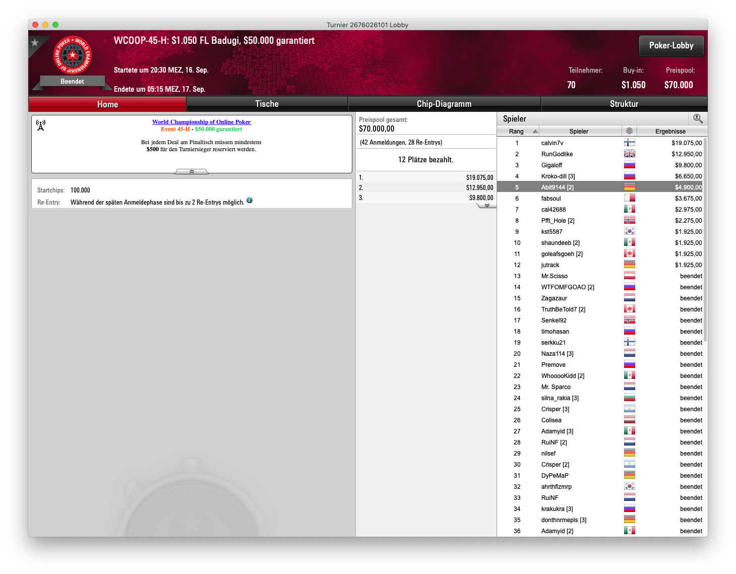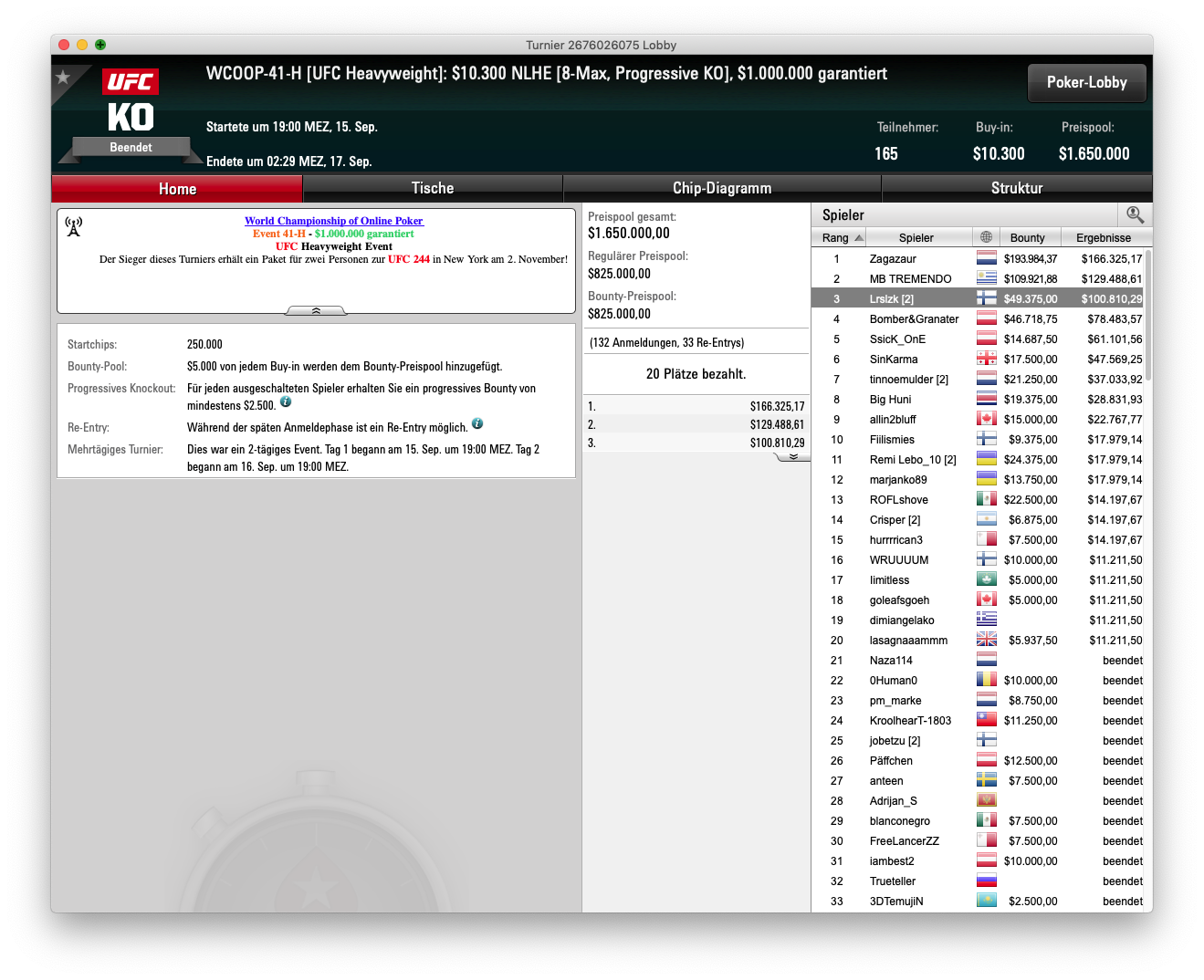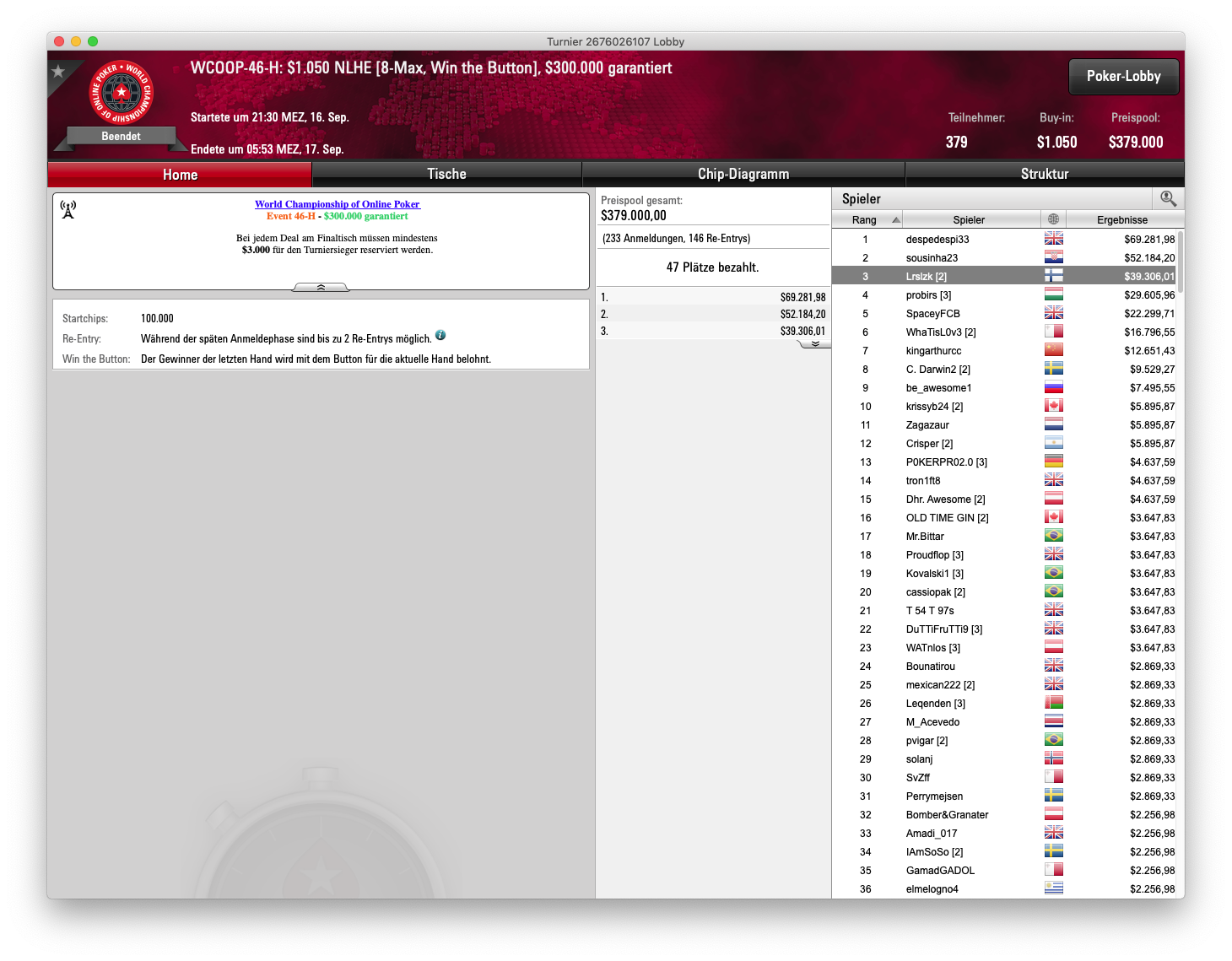 Am Ende durfte sich „Gaul4200“ mit seiner zweiten Bullet zum Sieger küren und bringt so einen weitere WCOOP-Titel nach Deutschland. Er gewinnt das Turnier nach einem Heads-Up-Deal mit „klauniq“ und darf sich daraus nun über $44.402,90 freuen. Der Tscheche „klauniq“ nimmt aus dem Deal $42.401,77 mit nach Hause. Auch am Final Table aus der Dach-Region waren „SebHug“ und „Kohlrabi7“, die sich mit Platz Sieben und Sechs über solide Cashes freuen durften. Diverse Pokerstars-Pros wie Lex Veldhuis, Benj „Spraggy“ Spragg, Fintan „easywithaces“ Hand oder Celina Lin versuchten sich ebenfalls, meist mit mehreren Bullets an dem Turnier. Am Ende konnte nur Arlie „Prince Pablo“ Shaban mit Rang 189 ein kleines Geld mit $219,17 einsacken.
