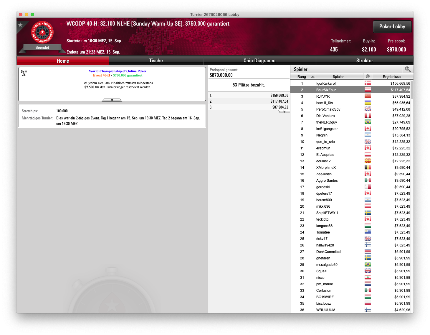 Der Österreicher „FourSixFour“ wurde im $2.100 NLHE Sunday-Warm-Up Turnier Runner-Up. Er musste sich am Ende gegen Grinder Simon „Igorkarkarof“ Pedersen geschlagen geben, der für den ersten Platz $156.669,56 mit nach Hause nehmen durfte. Für „FourSixFour“ blieben aus dem Preispool von $870.000, den 435 Buy-Ins bildeteten, stolze $117.407,54 für sein Pokerstars-Konto.