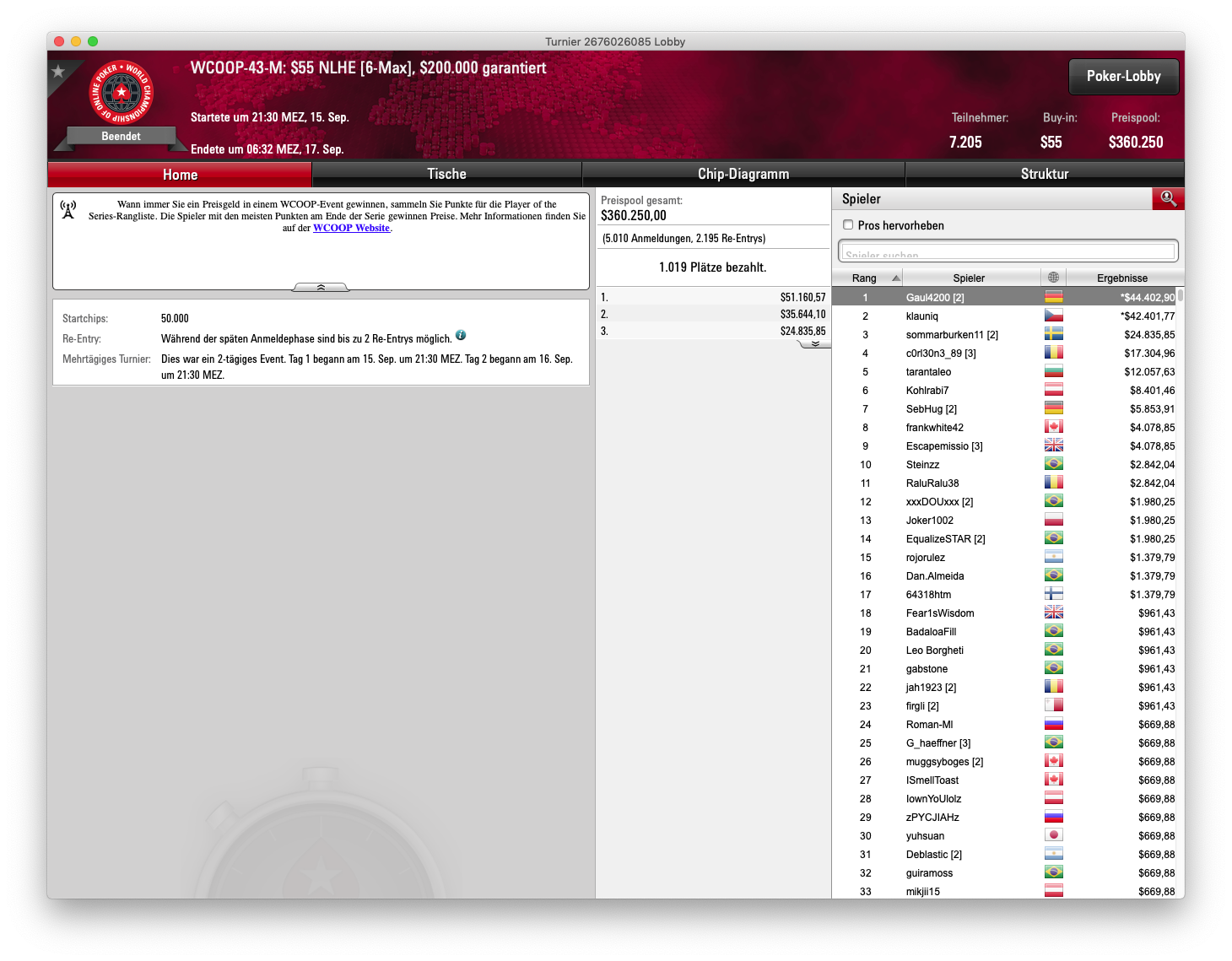 Und mit viel Action ging es auch dieses mal weiter an den Tischen der WCOOP auf Pokerstars. Am Montag starteten wieder eine große Runde an Turnieren aller Preisklassen, es gab für einige Turniere von Sonntag aber auch den Tag 2, so auch Event 43-M. Hier fanden sich bei einem Buy-In von $55 an 6-Max-Tischen 5.010 Spieler zusammen, die mit 2.195 Re-Entries einen Preispool von $360.025 zusammensetzten.